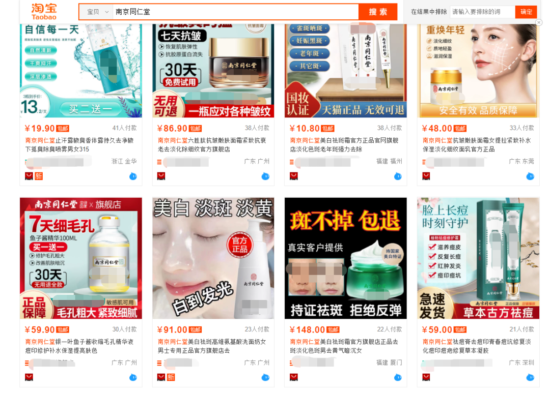 事实上,上述擦边“南京同仁堂”被处罚只是冰山一角。《化妆品观察》搜索发现,抖音、快手等短视频平台以及淘宝、拼多多等电商平台上,傍北京同仁堂、仁和药业、修正、白云山、协和等知名药企的化妆品套证乱象,比比皆是。